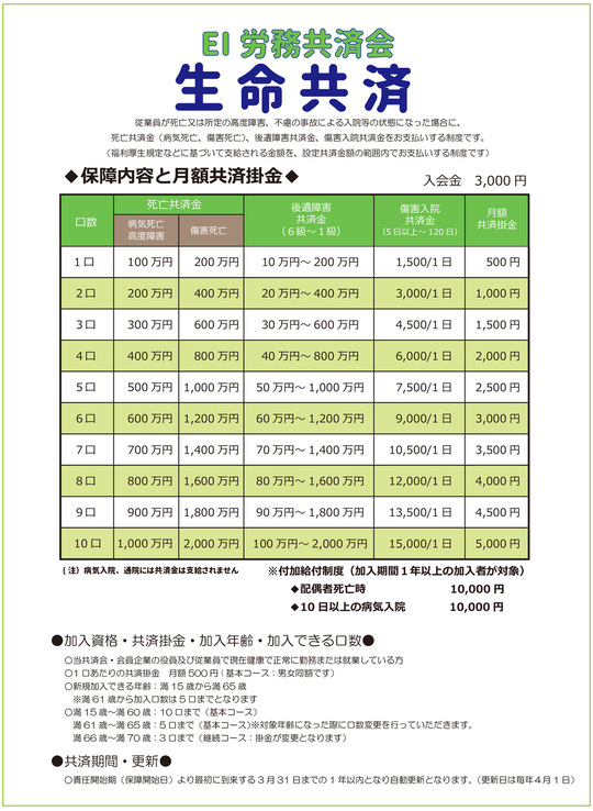 | EI生命共済制度 | 会員企業の従業員やご遺族の生活保障を目的とするものです。 保障内容と月額掛金は下記の表をご覧ください。 |